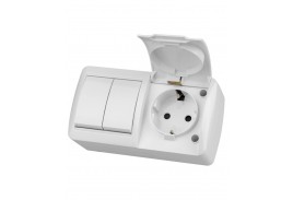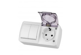 Блок выключатель 2-кл. 10А + розетка 2П+З 16А с защ. штор. с прозр. крыш. IP54 белый "Селигер" TDM